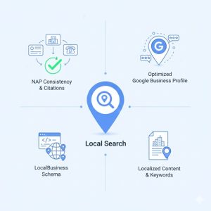 LocalBusinessبرای نشانه گذاری اطلاعات NAP به صورت مستقیم در کد سایت، به گوگل کمک میکند تا هویت و موقعیت مکانی کسبوکار شما را بدون ابهام درک کند.تولید محتوای محلی: هدف قرار دادن کلمات کلیدی با نیت محلی بالا (مثل: “بهترین مشاور سئو در اصفهان”، “خدمات سئو سایت در تهران”) در صفحات فرود محلی (Local Landing Pages).
